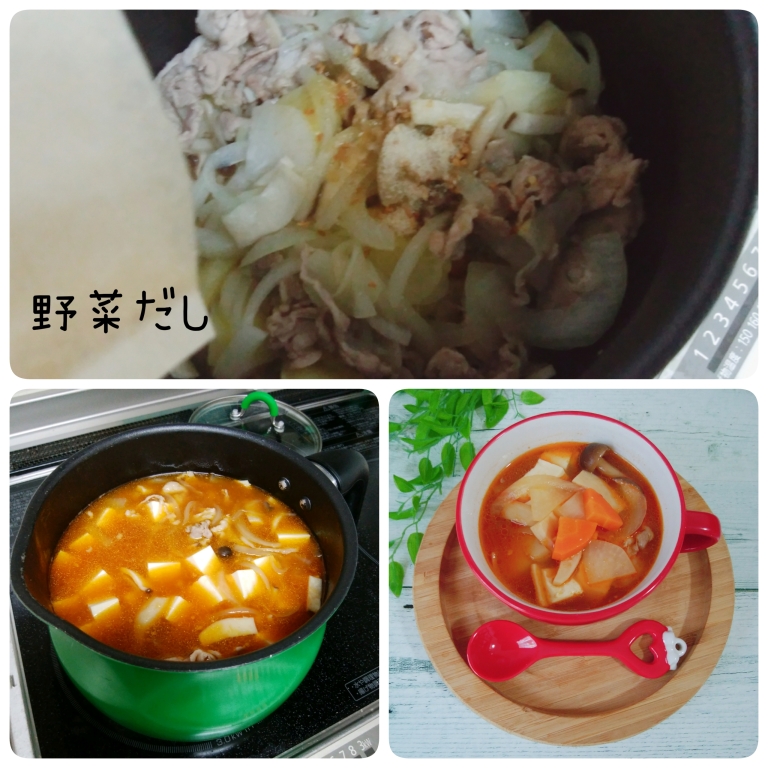 水1400cc、ダシダ大さじ2、アミの塩辛大さじ2、コチュジャン大さじ2、酒大さじ1、醤油大さじ1、ごま油大さじ1、砂糖大さじ2〜3、にんにくチューブ2〜3cm、唐辛子大さじ1/2、野菜だし1袋、これでスープができます。