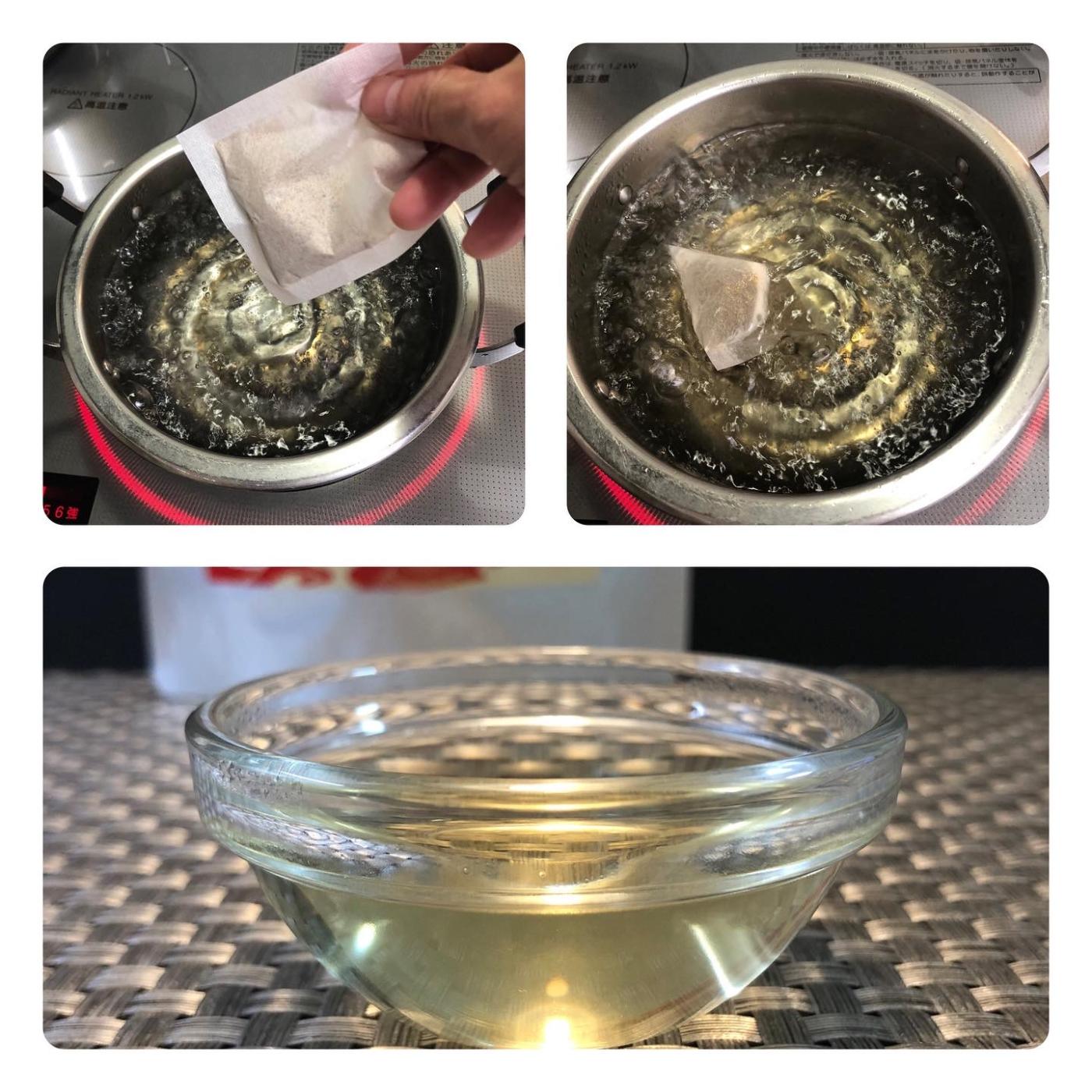 800mlの水に対して1包を入れ、沸騰したら中火で3〜4分煮出し、だしパックを取り出します。(濃いだしは水半量で作る)