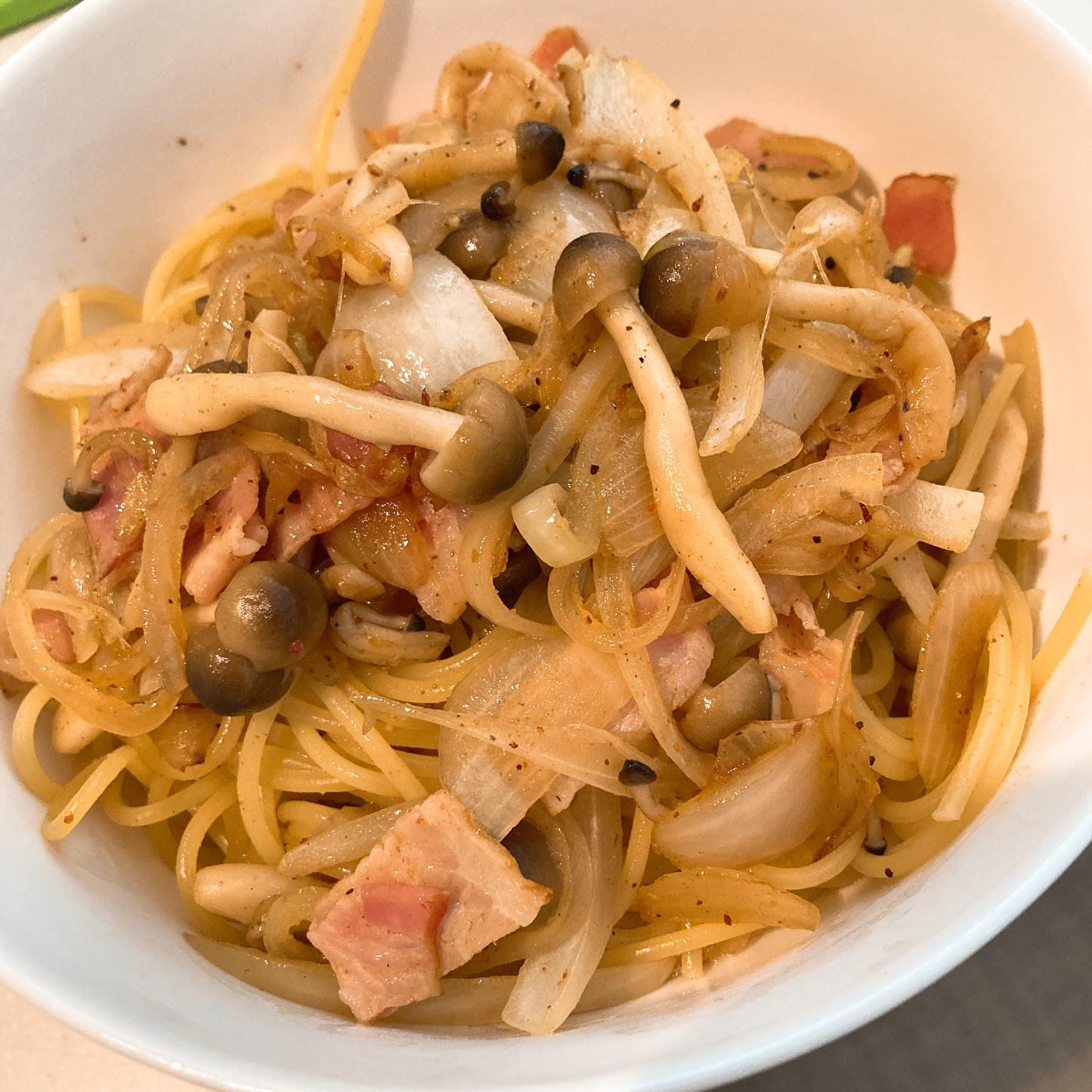 材料炒めて、出汁と少し醤油を加えて茹でたパスタと和えるだけ!