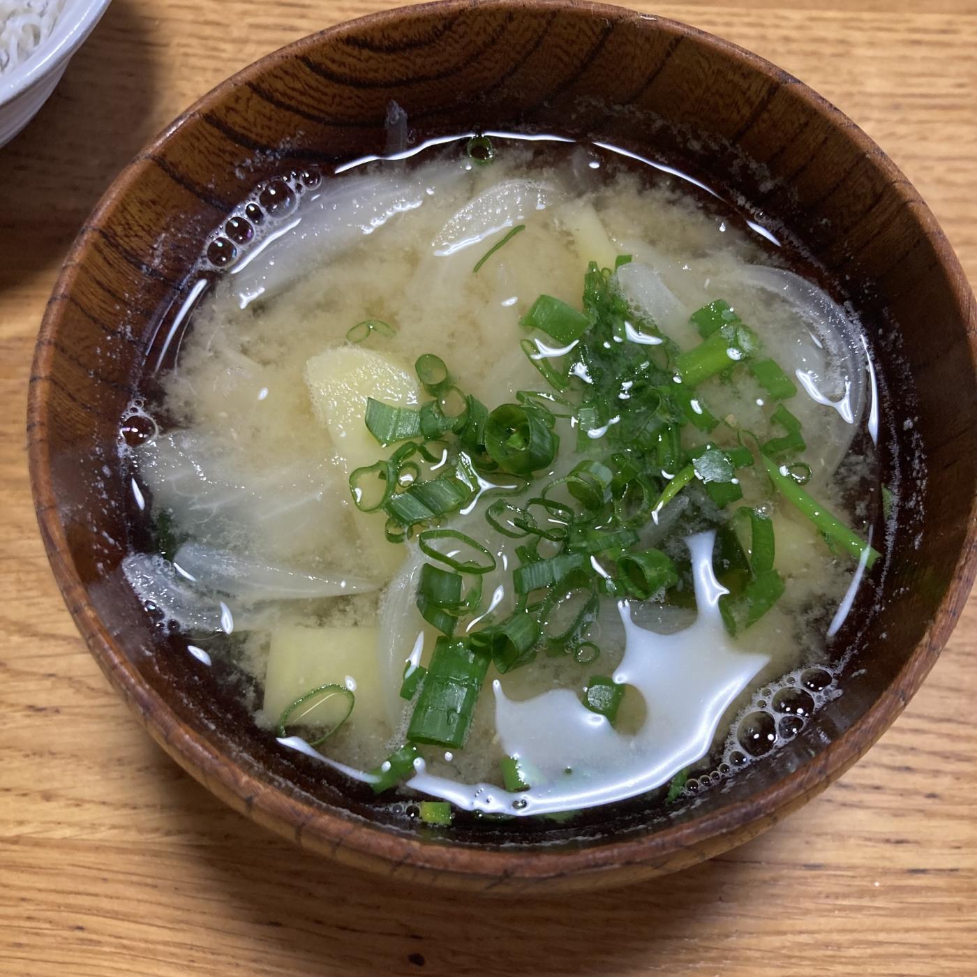 じゃがいもと玉ねぎの味噌汁には、じゃがいもと水、だしパックを入れて作りました。