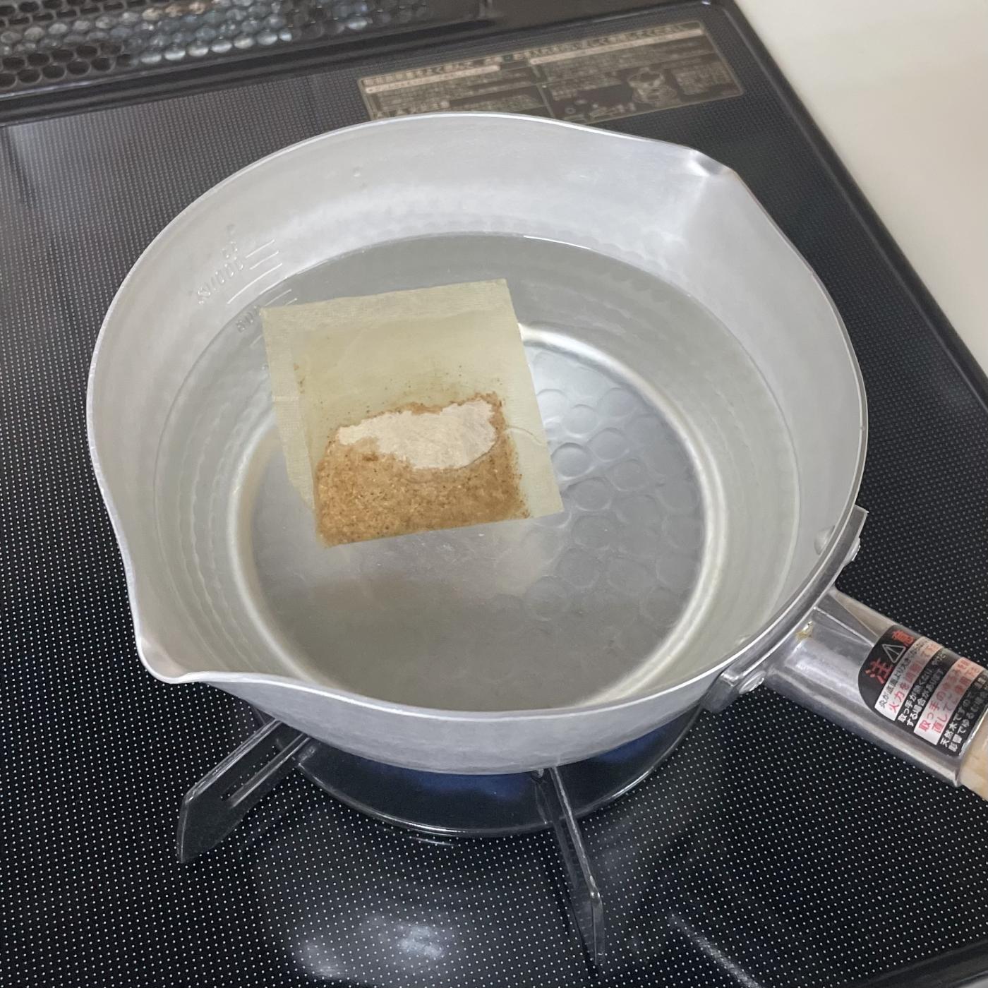 1.水500ccにあご入りふりだしを入れ、沸騰ご2、3分煮出す。