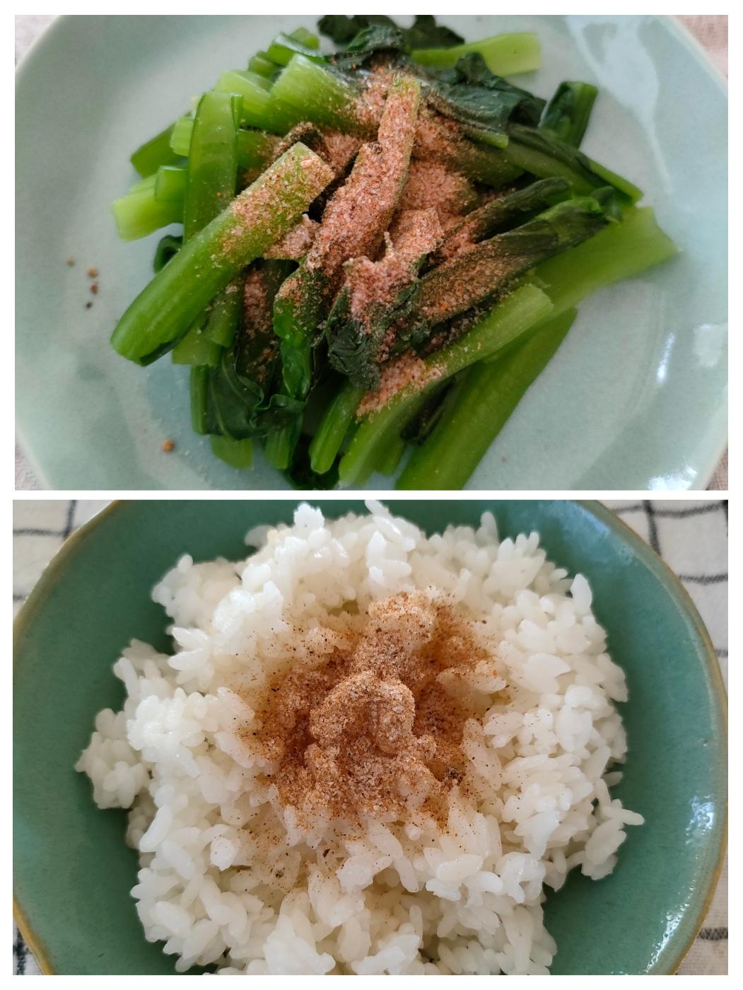 写真は小松菜を茹でたものと白飯にふりかけただけ。茹で野菜はブロッコリーやレンコンと何でも合いました。普段はドレッシングをかけていましたが、このだしをかけるとドレッシングは必要なし。
