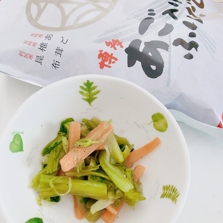 作り方は、小松菜とにんじんを茹で、パックを破った中身の粉末と、少量のお砂糖、醤油をほんの少し加えて混ぜるだけ♪