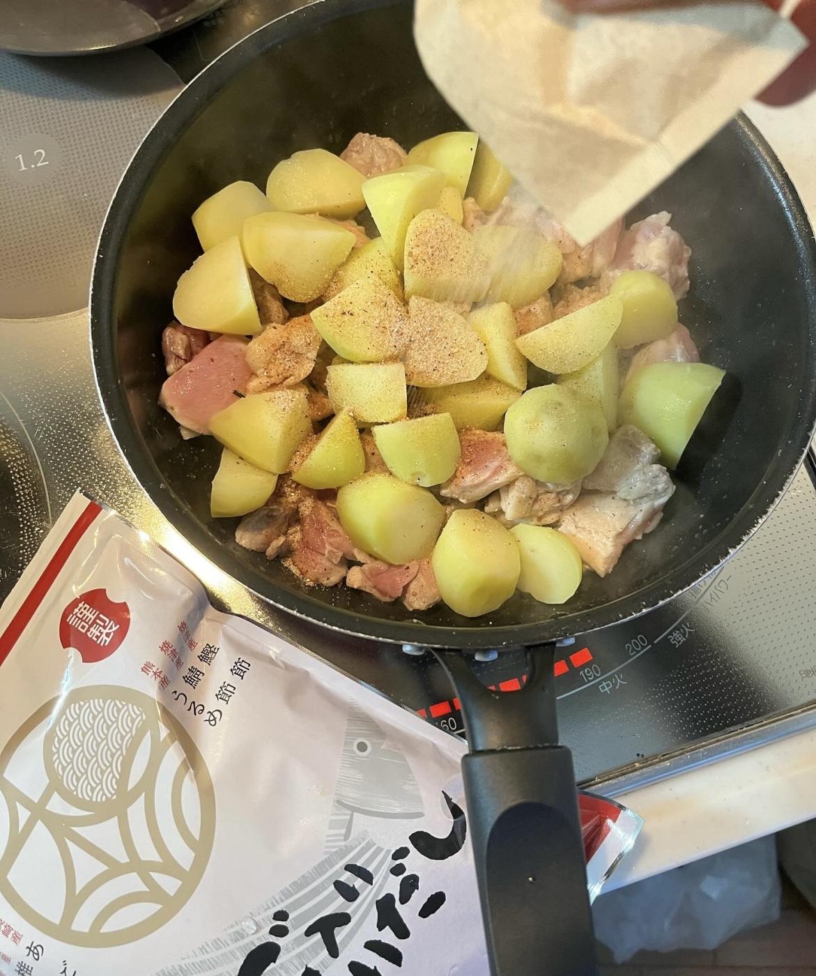 私は鶏もも肉とじゃがいもの炒め物にだしパックを一つ破ってふりかけました!