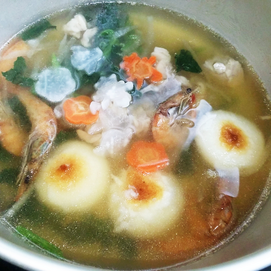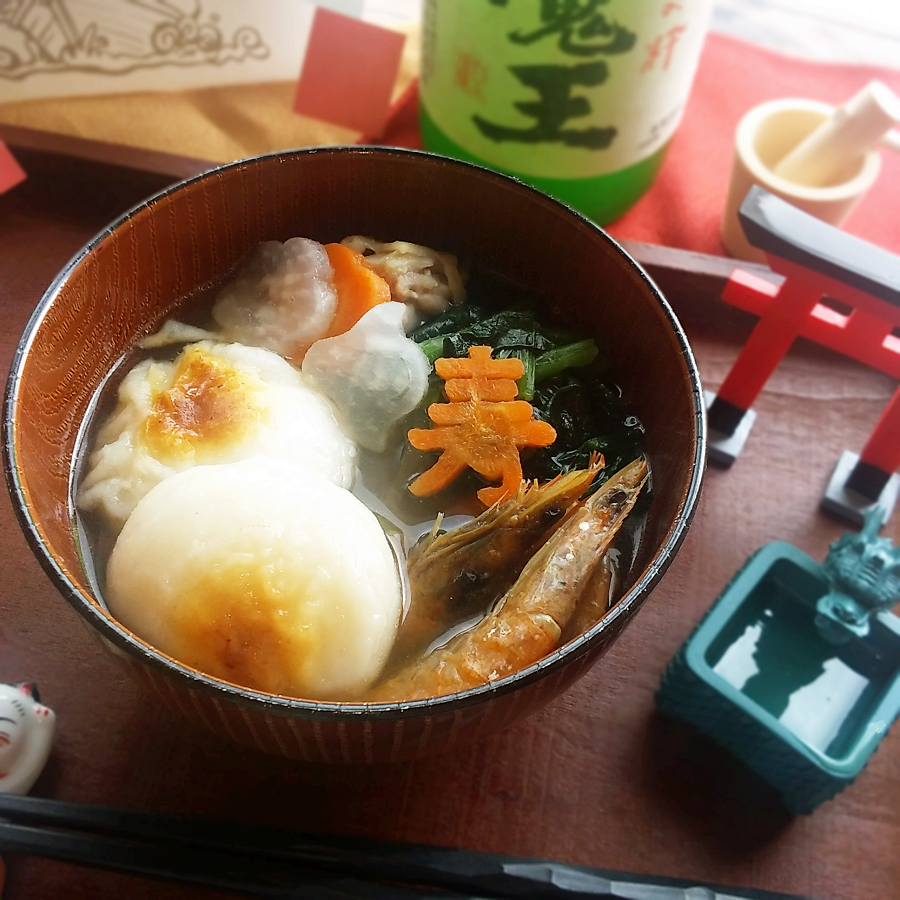 博多あご入りふりだしを使って作ったお雑煮です。焼き海老からも香ばしいだしが出て美味しいです。