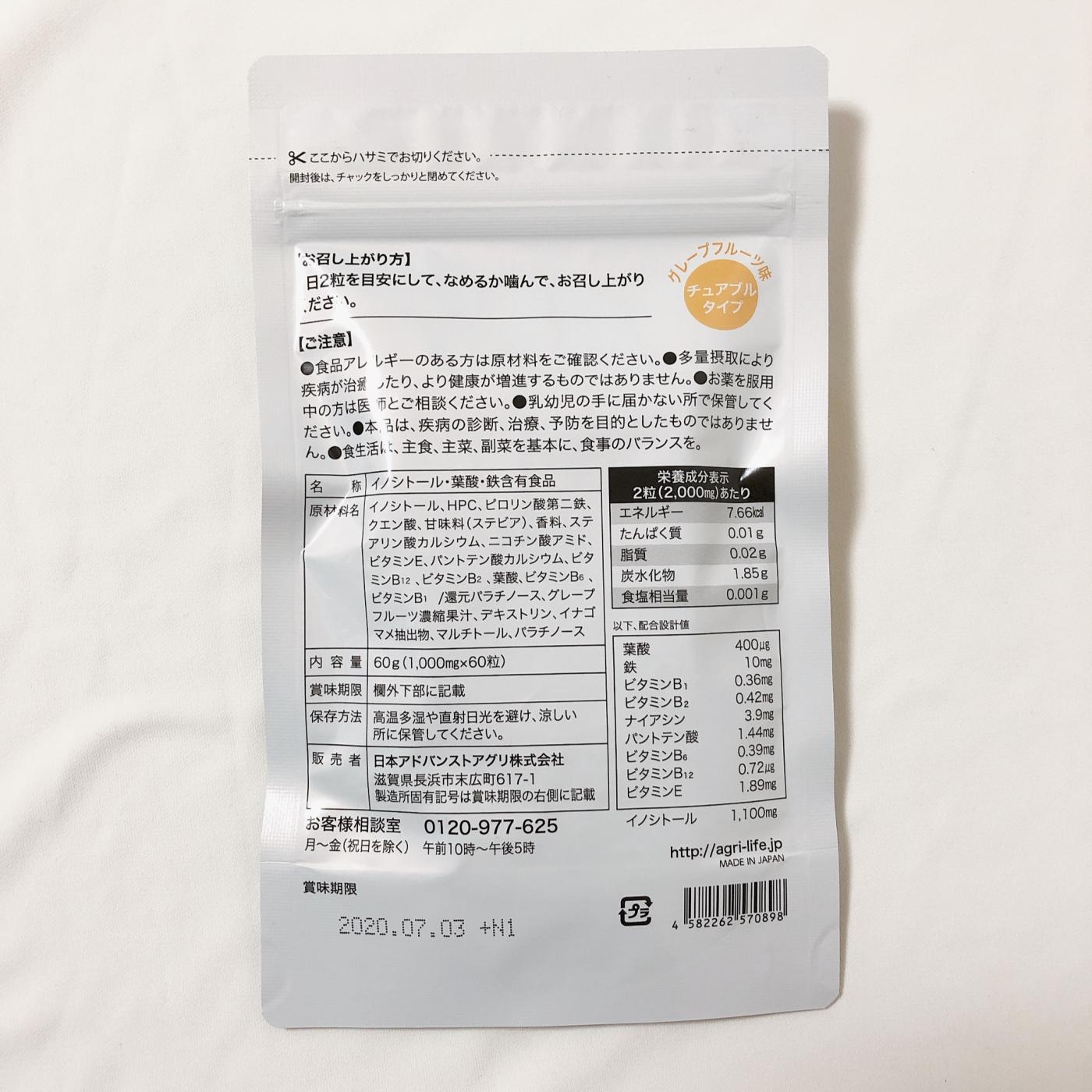 妊活サプリといえば「葉酸サプリ」が定番だけど、このサプリはミオイノシトールという成分が配合されています。ミオイノシトールは母乳や粉ミルクにも含まれている成分です。糖コントロールや細胞の成長に必要な成分で、体内にも広く存在している栄養素です!精米後の米ぬかから抽出して作られるんだって♪