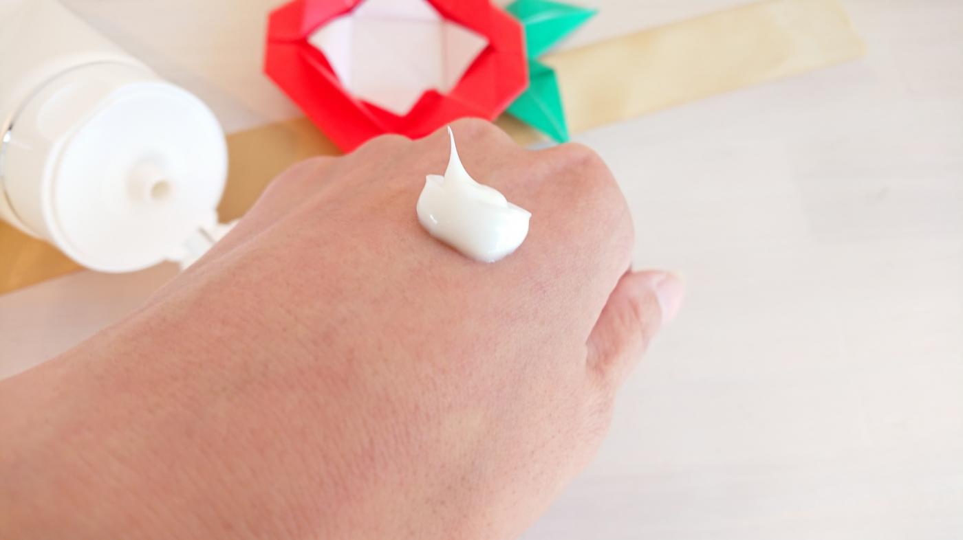 それらの成分がハリとツヤのある引き締まった肌へと導きつつ、塗った直後から肌へ浸透するのでベタつきがないそう。