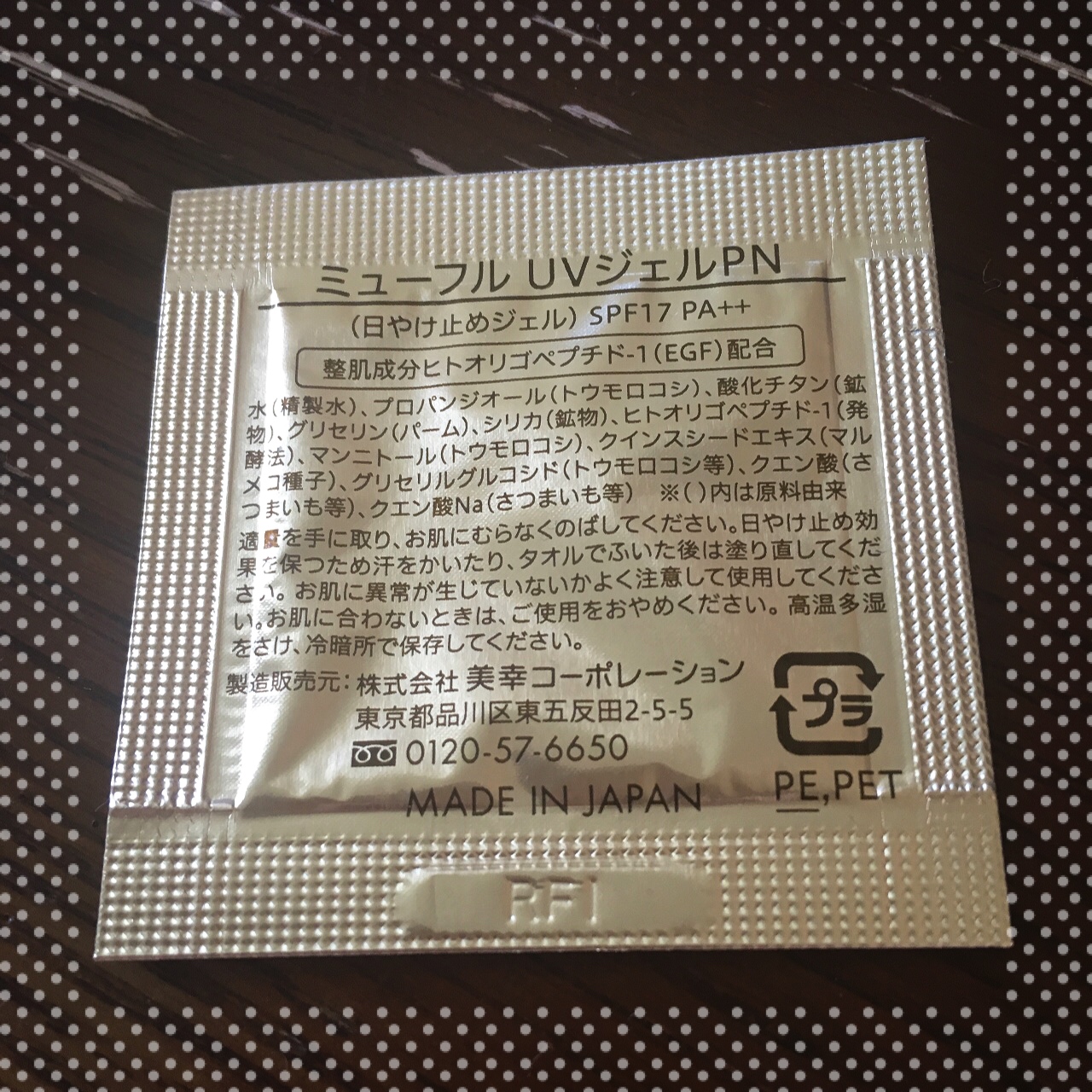 ミューフル UVジェルPN ラミネートパック5個セット(5回分) 「日焼け止め・紫外線吸収剤不使用 」