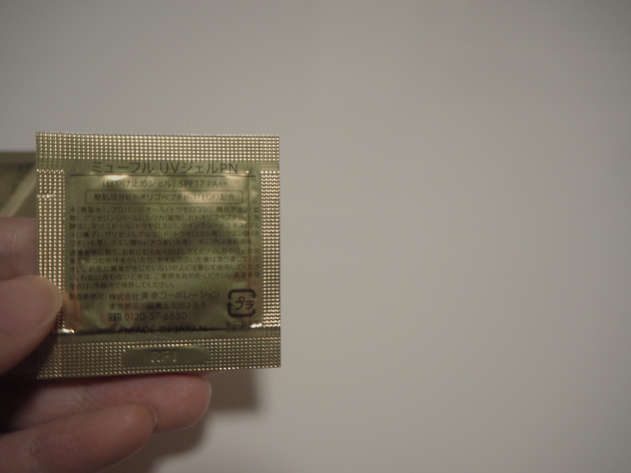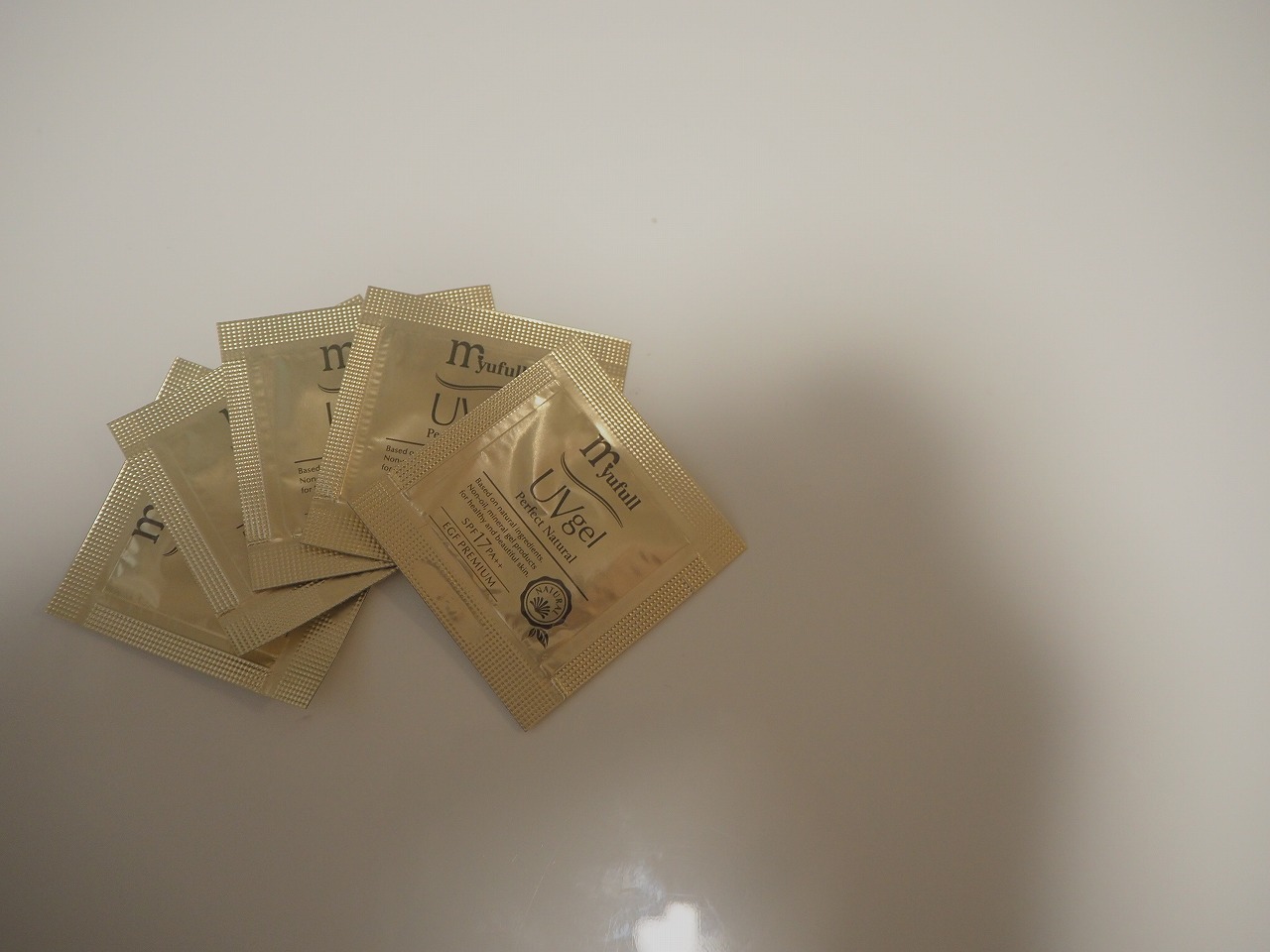 ミューフル UVジェルPN ラミネートパック5個セットは、紫外線吸収剤不使用のUVジェル。スキンケアで肌を整えたあと、1円玉大を手にとり、顔全体に伸ばすだけ。今回試したのは、これ。
