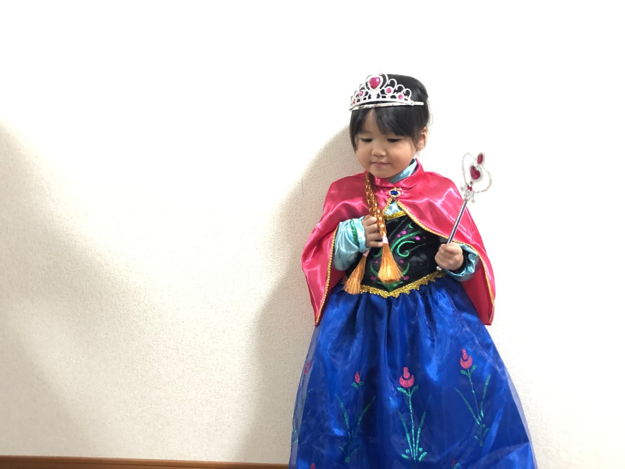 後はワンピースを着る要領で着せてあげれば、アナ女王の完成です。ママも学生時代はコスプレしていたので、なり切った楽しみは少しばかりはわかっているつもりです。女の子ならではの楽しみの共通。