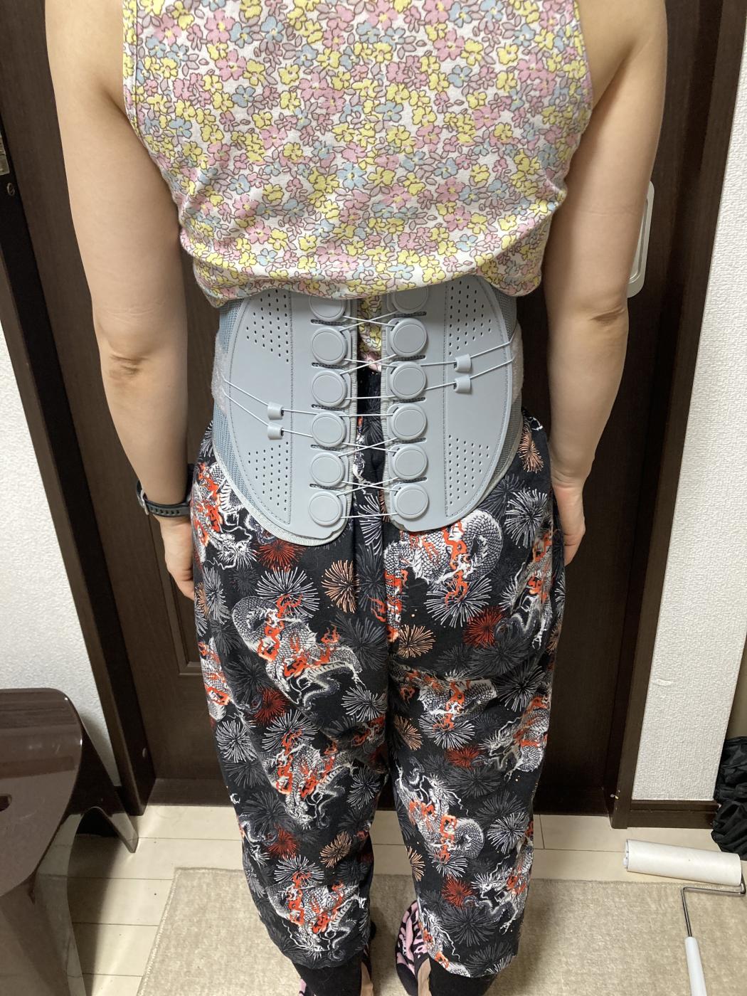 なんか見た目が複雑そうで、どうやってつけるの?と思ったのですが、細いストリングスががたくさんあってどうやるのかなと。つけてみると意外に簡単。ベルト装着後にひもをきゅーっとしめるだけ!感動の締まり感!(^^♪さっと腰に巻いて紐をひくだけなので、高齢の方でもやりやすいし強い力はいらないですね。簡単で使いやすいの大事ですよね。