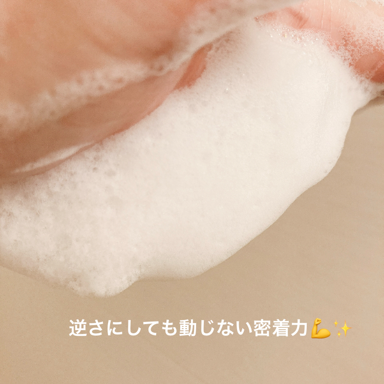 モコモコ泡は濃密で、逆さにしても垂れたり落ちたりしにくく密着感あり、
