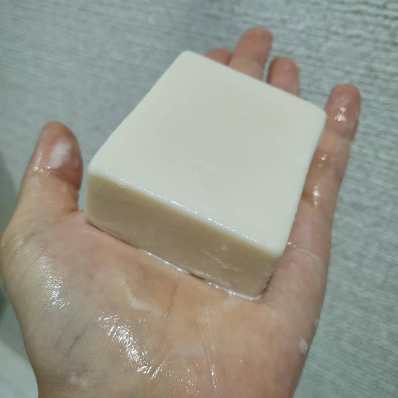 届いた石けんは、四角い白い石けんで、手作り感も感じられます。普段も石けんを使っていますが、洗顔後のツッパリ感も感じることもあって…。