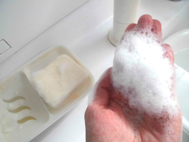 乳白色の石鹸で、ほのかにラベンダーの良い香りが漂ってリラックスしながら使用する事が出来ています。きめ細やかな泡をたっぷり作る事が出来、洗いあがりがしっとりすると感じました。