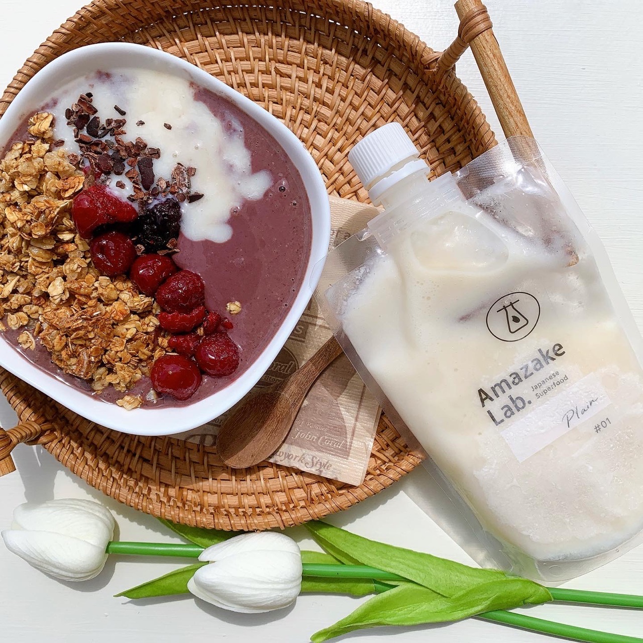 砂糖不使用のアサイーピューレでアサイーボールをつくり、お好みのフルーツとオートミールを適量トッピング、さらに、あまざけPlainをトッピングして甘みを加えれば、甘みとコクが増していつもより美味しいアサイーボールになりました♪