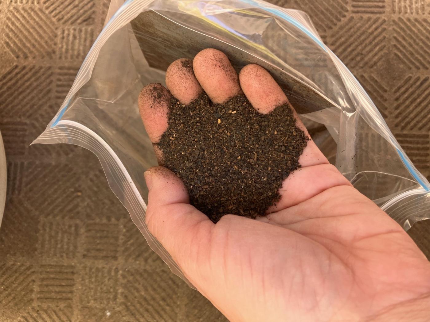 早速試してみました。ごく少量のサンプルを頂きました。結構匂いがあります。私は混ぜ込む方式ではなく表面の土にかける方式で今回は使用させていただきました。サラサラな土みたいな感じです。