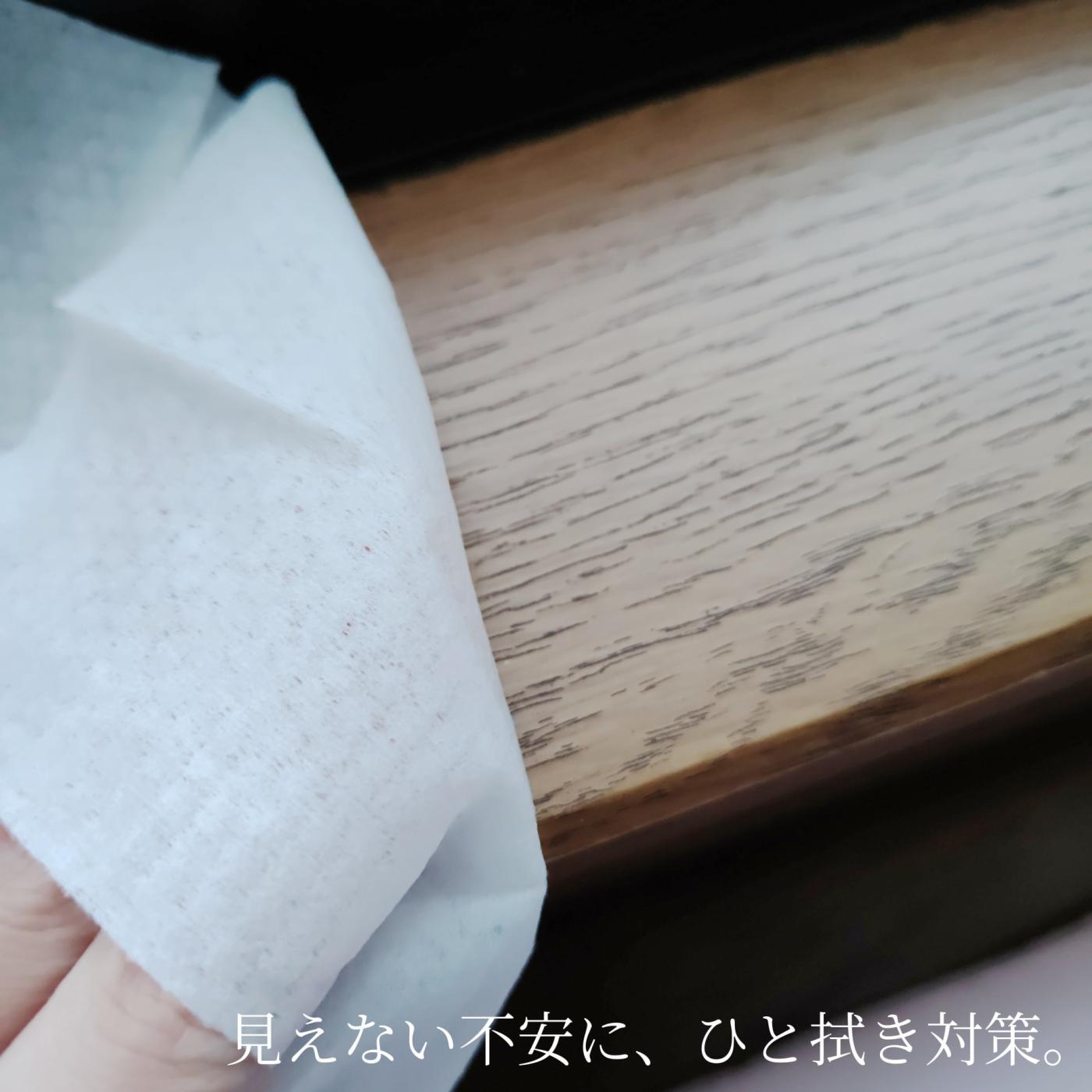 実際に使用してみると、ドアノブやテーブル、リモコン、スマートフォン周りなど、日常的によく触れる場所にサッと使えるのが便利でした。拭いた後もべたつきにくく、日常生活の中で取り入れやすい使用感です。