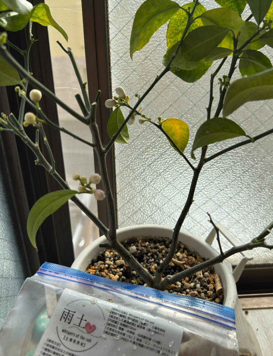 あと、植物のどの成長段階にも使える、撒くだけでも使えるということなので、花が咲き始めたレモンの鉢植えにもパラパラとまきました。