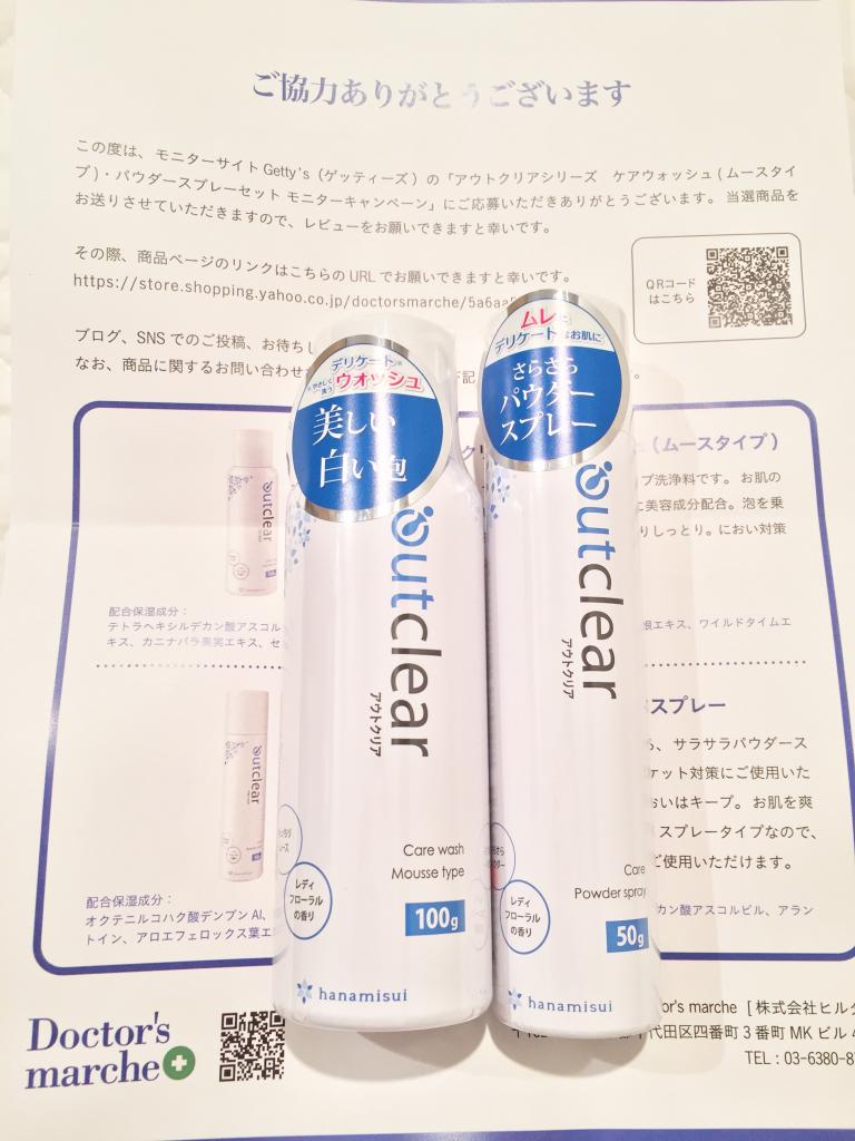 コエタス経由で株式会社ハナミスイ様よりアウトクリアケアウォッシュ&パウダースプレー お試しさせて頂...