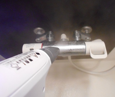 そしてカランの左端の方にボタンみたいなのがあるんですが、その周りも汚れ(水垢ではない)が全然落ちなかったのに、スチームを当てていたら汚れがふやけて簡単に落ちてこちらも綺麗になりました。