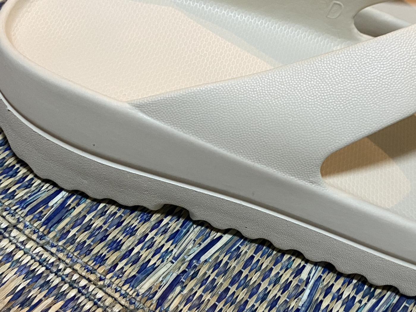 実際に手に取ってまず驚いたのは、その軽さ。厚底サンダルは重いイメージがありましたが、このサンダルは本当に軽く、持った瞬間に「これは歩きやすそう」と期待が高まりました。履いてみると、足裏にふわっと吸い付くような柔らかさがあり、クッション性の高さをしっかり実感できます。