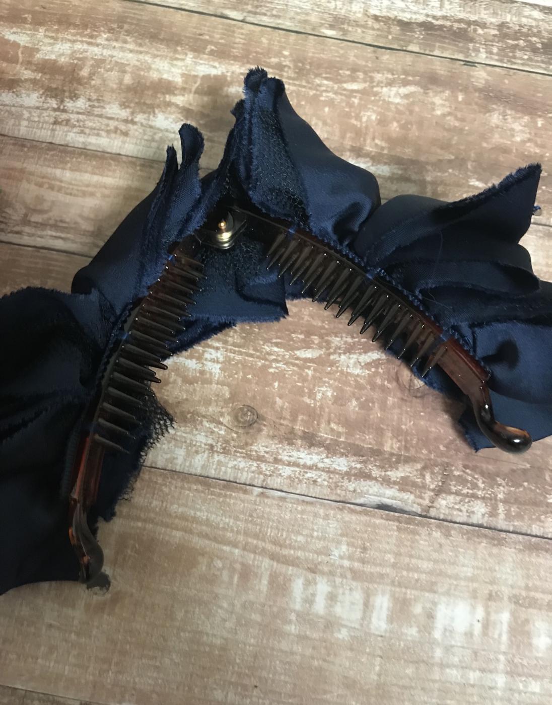 サテンの生地で作られている、リボンのような形の可愛らしいバナナクリップになります。