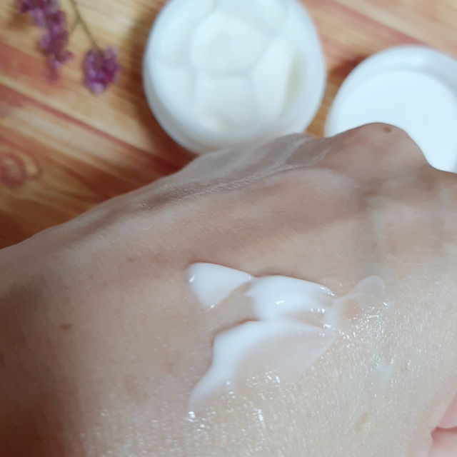 見た目も使い勝手も、普通の白いクリームです。みずみずしくて、洗顔後すぐに使っても重くありません。塗った瞬間はわりとコックリですが、馴染ますとべたつかずに程よくしっとりします。