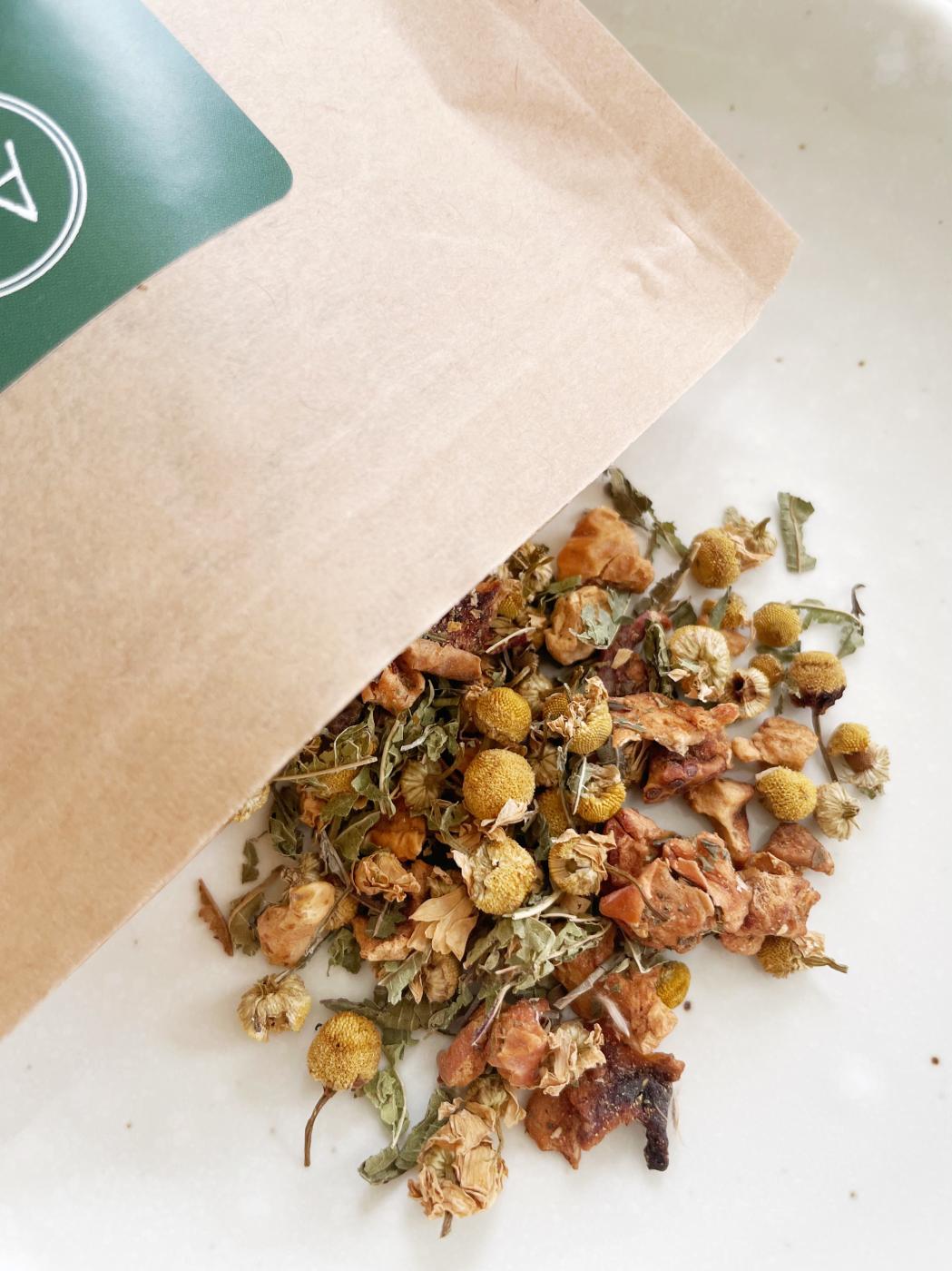 最近、こころと身体を整えるためにハーブティーをいただいています。こちら、Appeal auauさんのこころティー。不安や緊張、ストレスなどで寝つきが悪い方におすすめのブレンドだそうです。