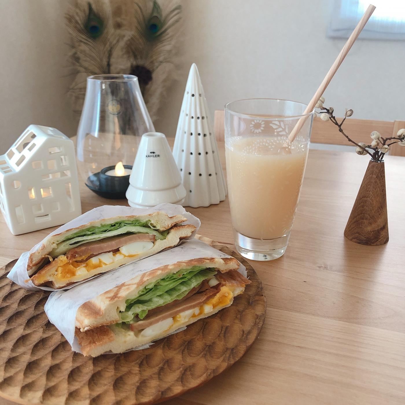 木製プレートに乗せたホットサンドと、木のストローで飲み物を。