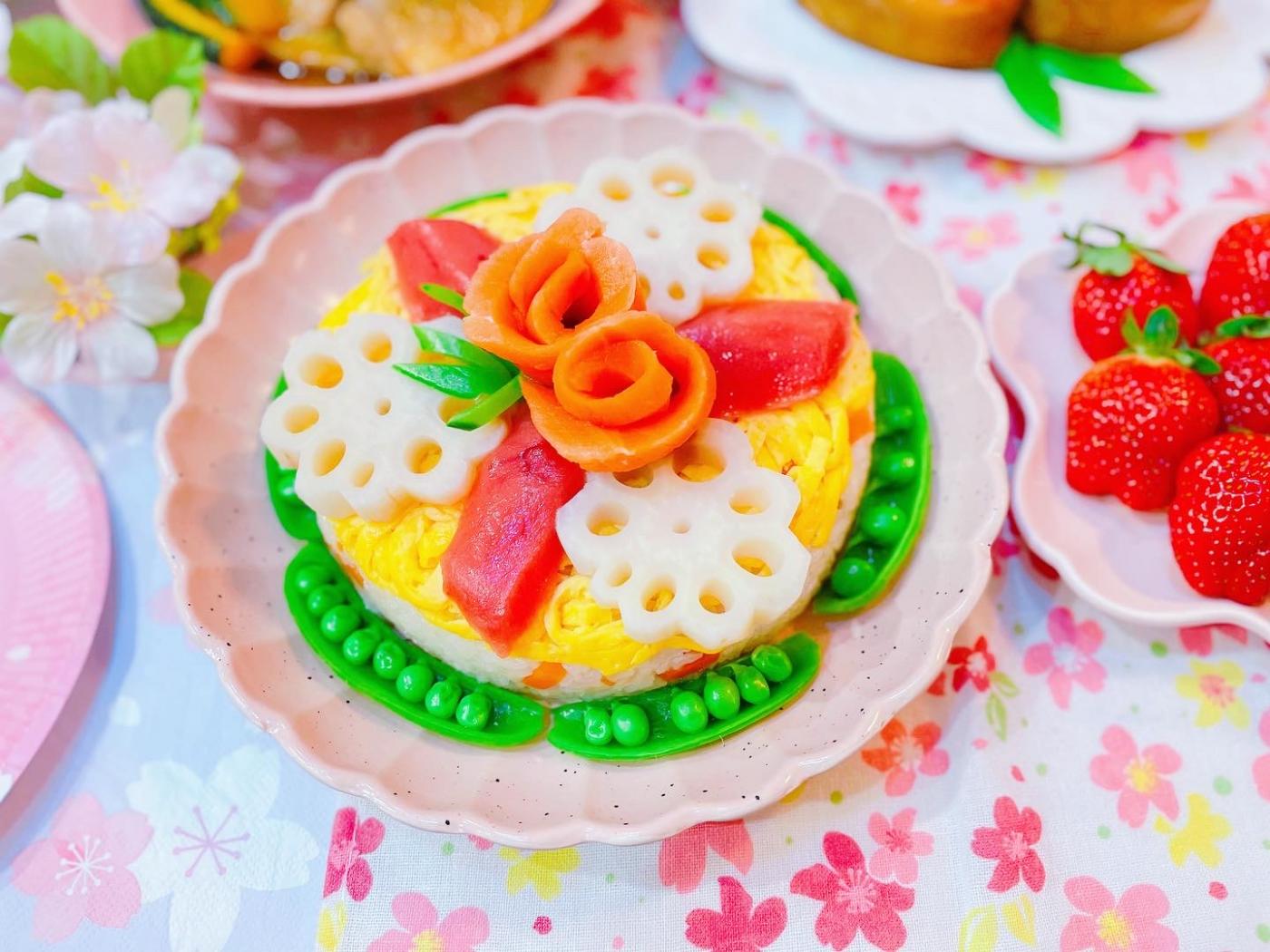 ひな祭りにちらし寿司ケーキを作ったので、上に奇跡のれんこんを飾りました。このはみ出る大きさ、伝わりますか?とても綺麗で立派なのです。