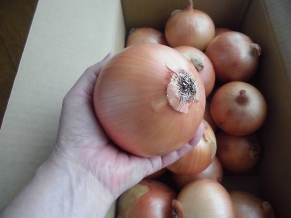 収穫後、タマネギ小屋やコンテナで乾燥させているので