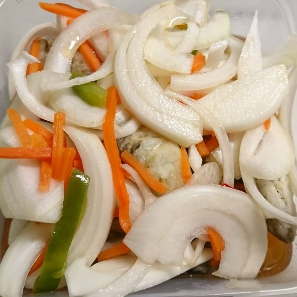 出来上がりは、野菜→小鯵→野菜の順で敷き詰めて、その上から甘酢をかけて完成。