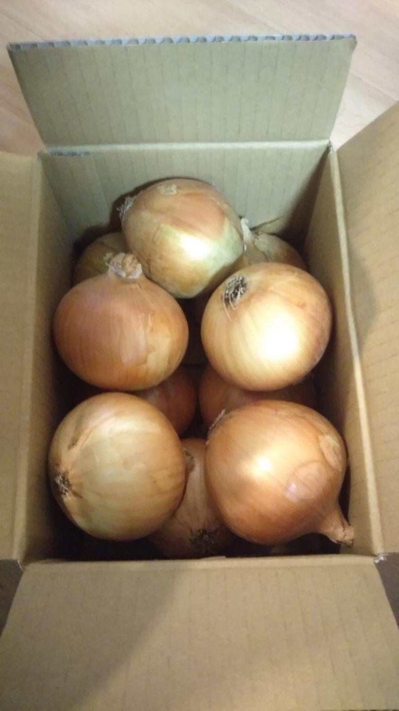 段ボール箱を開けると、10個入った大きな玉ねぎがゴロゴロ!