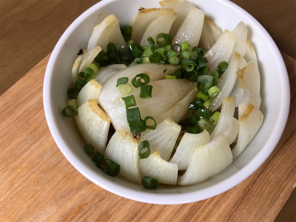 耐熱容器に玉ねぎを入れて、上にバター、コンソメ顆粒か、めんつゆを適量、レンジで5分ほどチン!