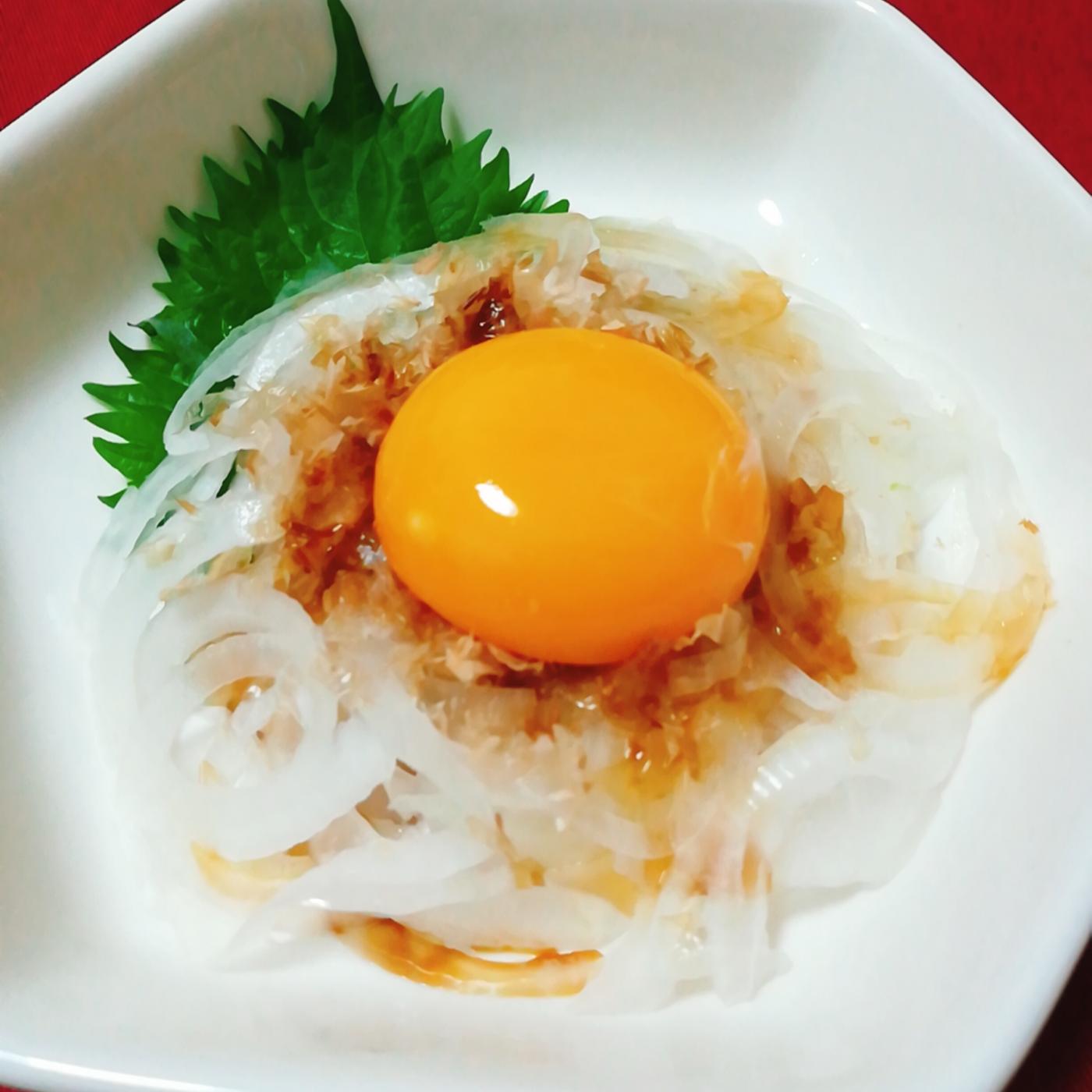 かつお節と醤油をかけたオニオンスライスに、更に卵黄を合わせると、コクとまろやかさが加わってまた違った美味しさが楽しめました。
