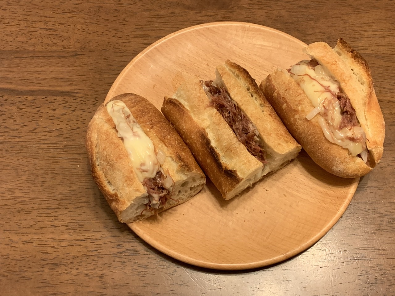 あとは、夫の好物のコンビーフと合わせてサンドイッチにしました。玉ねぎは粗みじん切りにして、コンビーフと炒め合わせ、モッツァレラチーズを溶かしてトッピングしました。バゲットに挟みましたが、何回も食べたくなるおいしさでした。