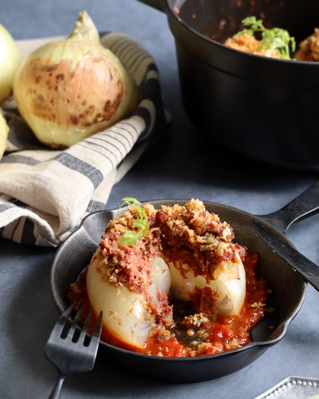本来お米を詰めて作る「ドルマ」ですが、今回は、お米は使わず、クミンなどのスパイスを効かせた炒めたコンビーフを詰め、カットトマトとともに無水調理したあと、パン粉をかけてオーブンで香ばしく焼き上げました。