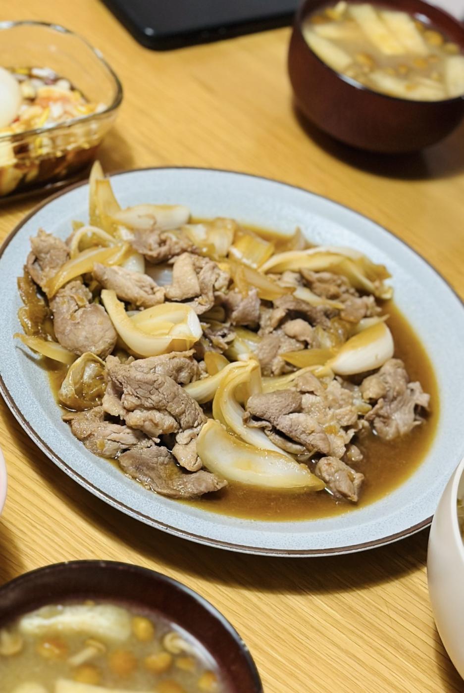 写真に載せた物は、新玉ねぎをまるまる1個使った豚の生姜焼きです。