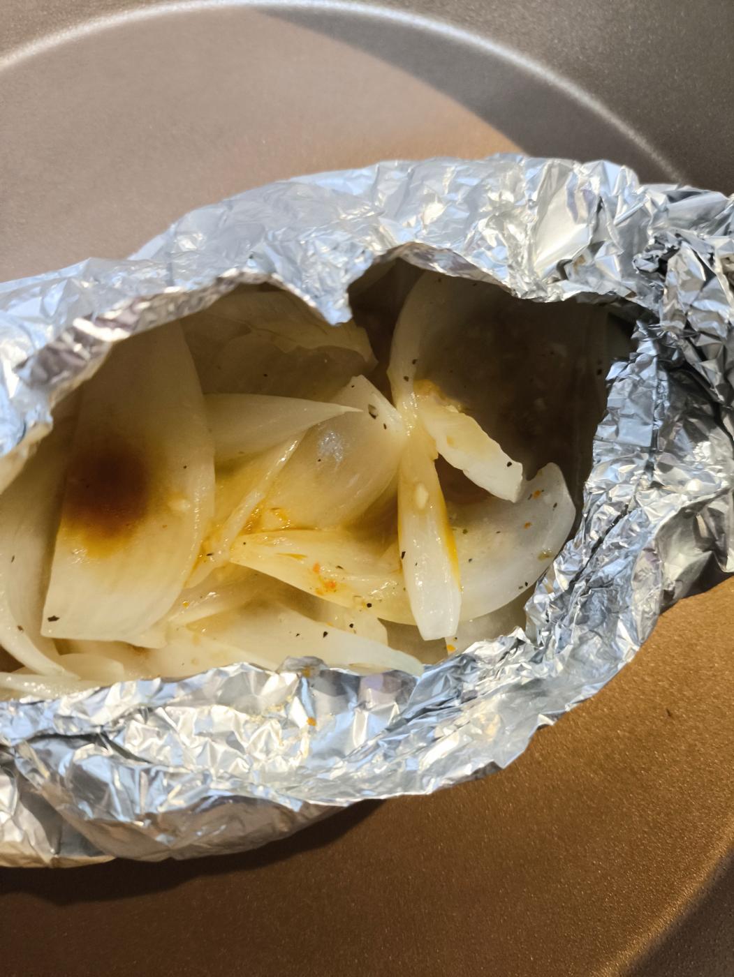 ①たまねぎを食べやすいサイズにカットしてアルミホイルに並べる