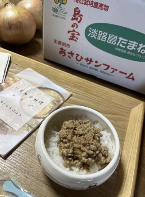 こんなに大きくて立派な玉ねぎ、今までに見たことがありませんでした!!さすが淡路島の玉ねぎ!!さっそく半分に切ってみると、みずみずしい!!そしてぎっしりと身が詰まった感じがありました。色々なレシピを考え中ですが、まずは、玉ねぎを粗めに刻んで、挽肉と炒めてそぼろを作りました✨白ごはんに乗せて丼ぶりにしていただきました😋家族みんな、あっという間に完食でした👏‼️少し大きめに刻んだ玉ねぎは、シャキシャキ具合もいい感じで、新鮮さが分かりました✨