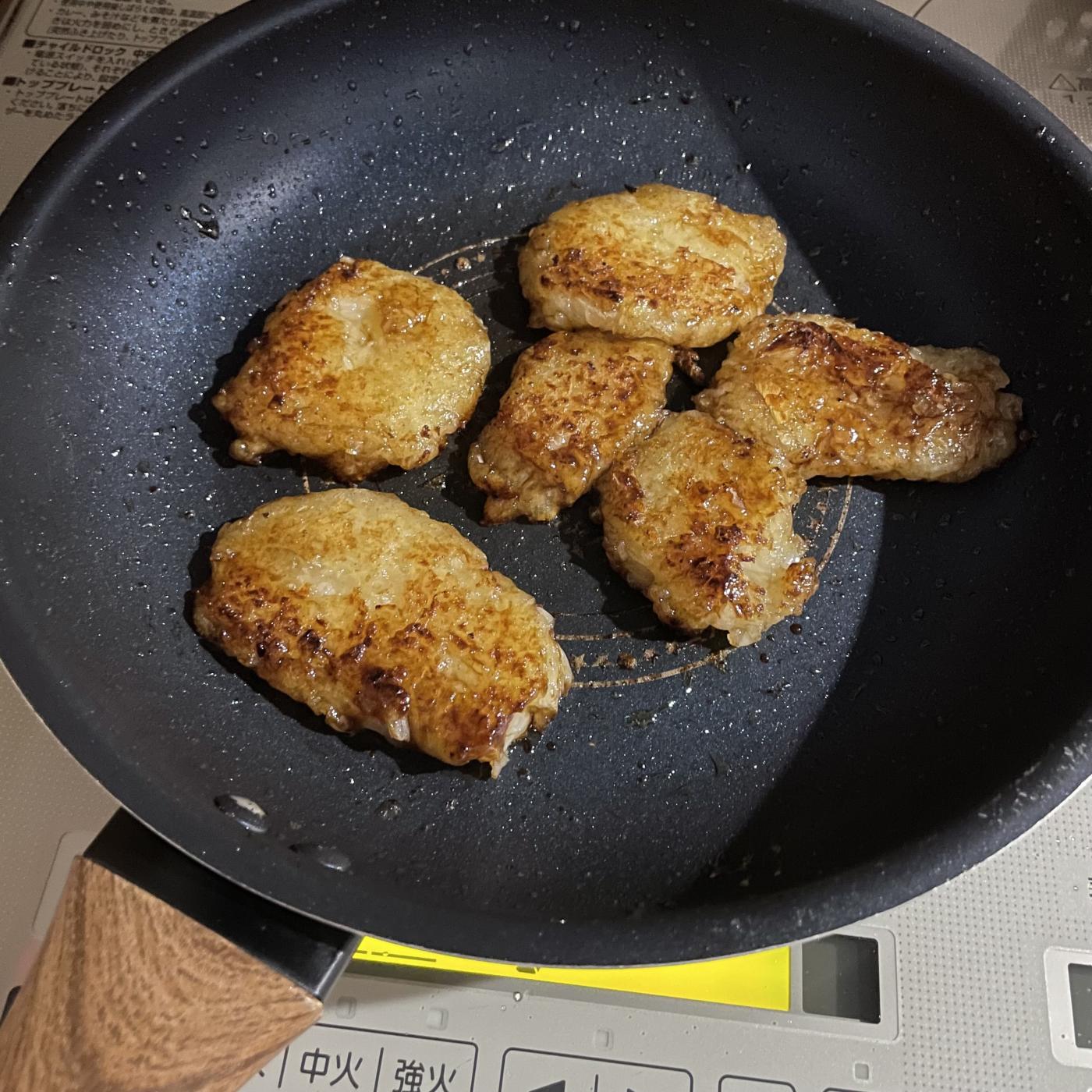 ④両面に焼き目がついたら火を弱めてウスターソースを全体にかける
