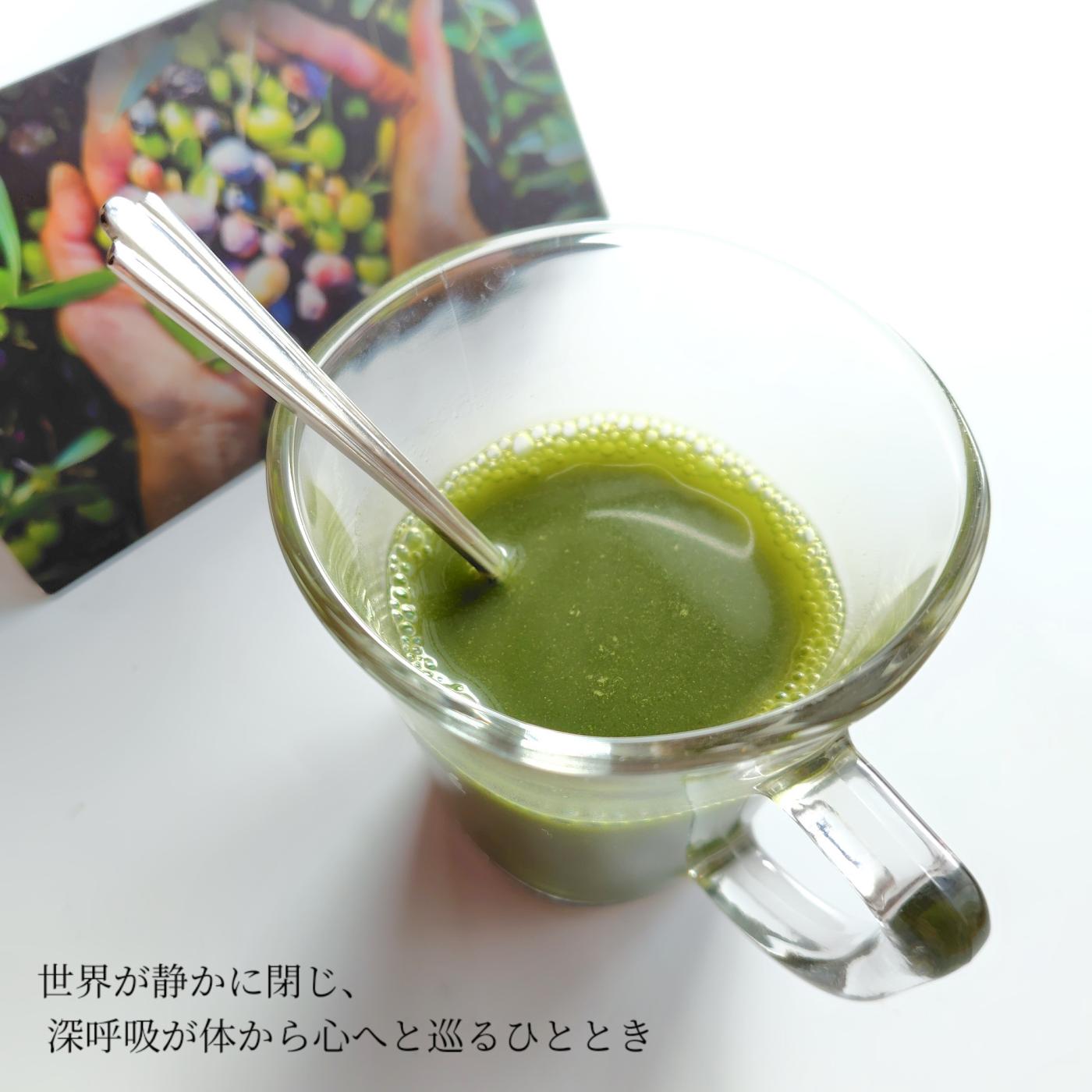 グリーンの粉末で、水に溶かすと青汁のような見た目。