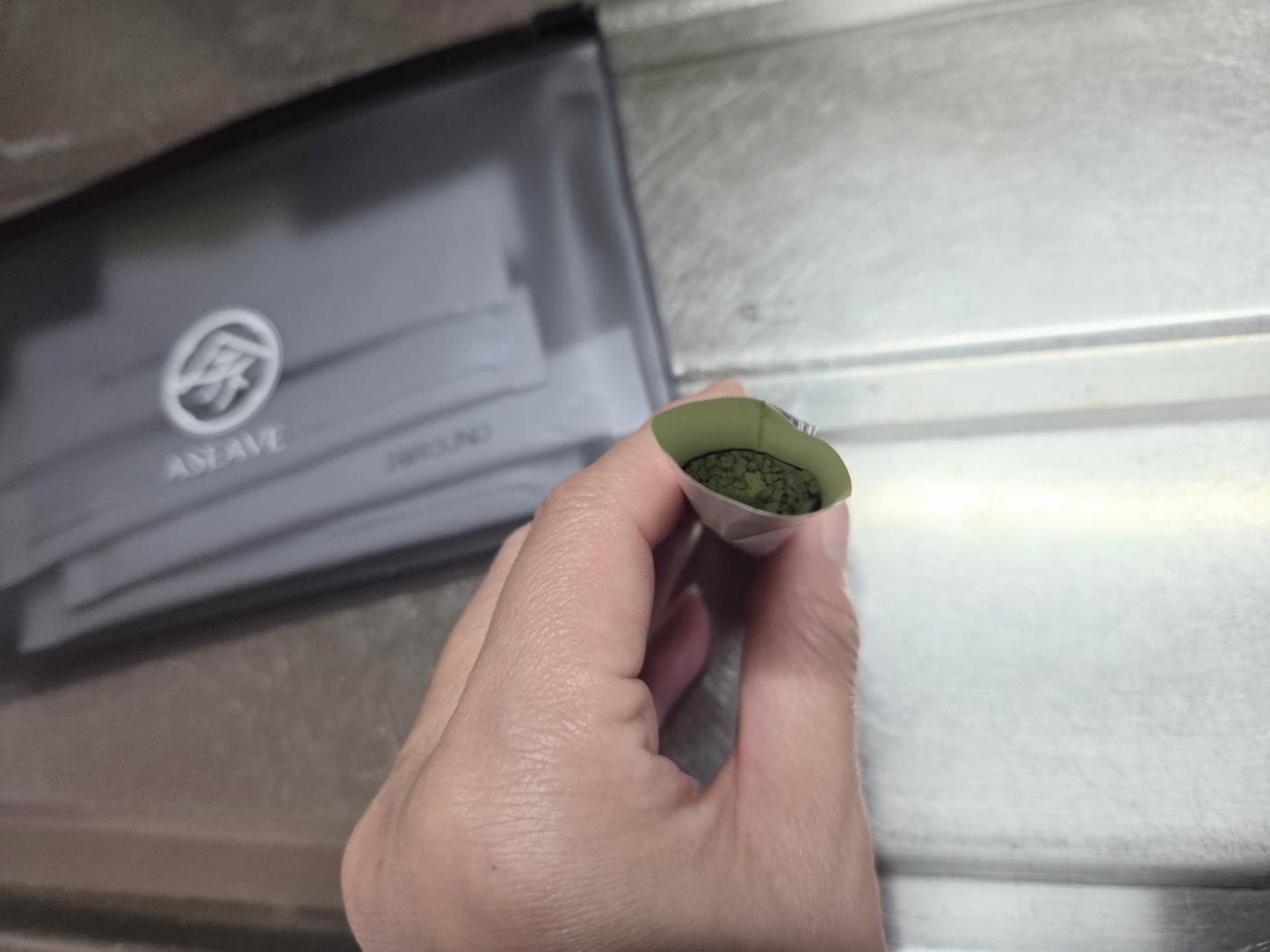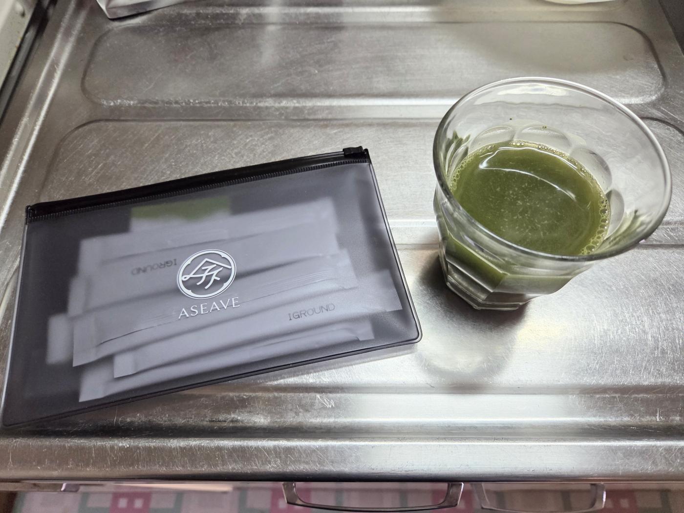 常温の水を注ぐと、青汁のような濃い緑色のドリンクになりました。