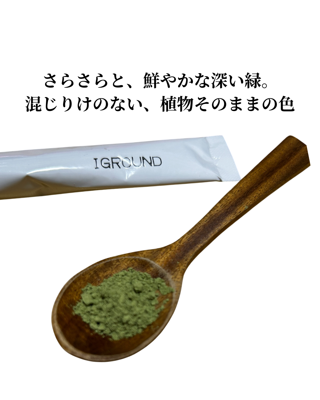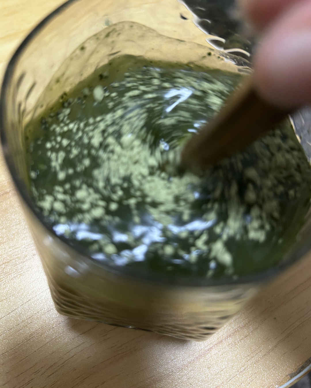 スプーンですくってみると、驚くほど鮮やかで深い緑色のパウダー。さらさらしていて、混ぜるだけでさっと溶けていくんです。