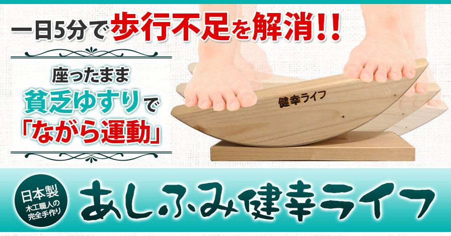 「足ふみ健幸ライフ」は、「座ったままウォーキングができる健康器具」というコンセプトで開発された世界初の画期的リハビリ製品です。電気もモーターも使わない簡単な木製製品でありながら、足の弱った高齢者でも楽に歩行運動ができる健康機器です。その貧乏ゆすり(ジグリング)効果によって、歩行機能の改善だけでなく、認知症やロコモ(運動器)疾患の予防にも効果があり、医療費・介護費の抑制や高齢者の健康寿命の延伸にも貢献できる、まさに、これからの超高齢社会に求められる製品と言えます。