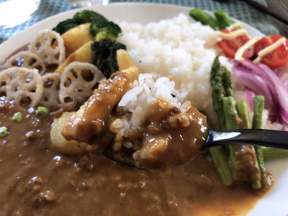 たけのこ、れんこん、アスパラ、ブロッコリー、新じゃがなどを素揚げして、ご飯に並べ、砂糖えんどうや自家製玉ねぎピクルスを添えて、最後に淡路島咖喱をかけてみました。