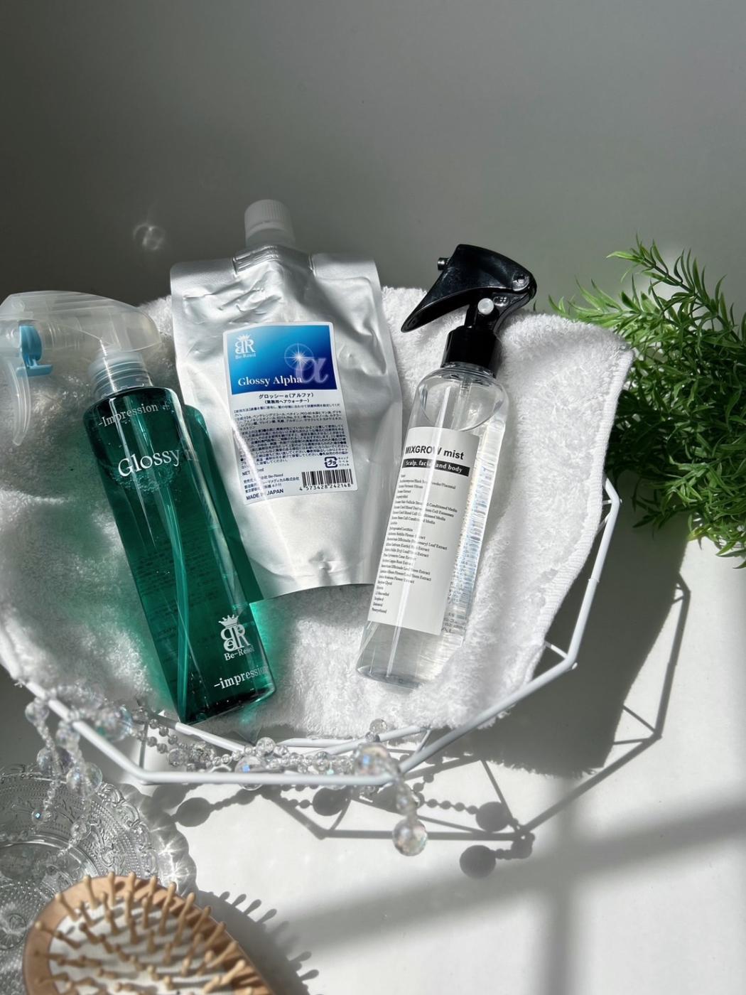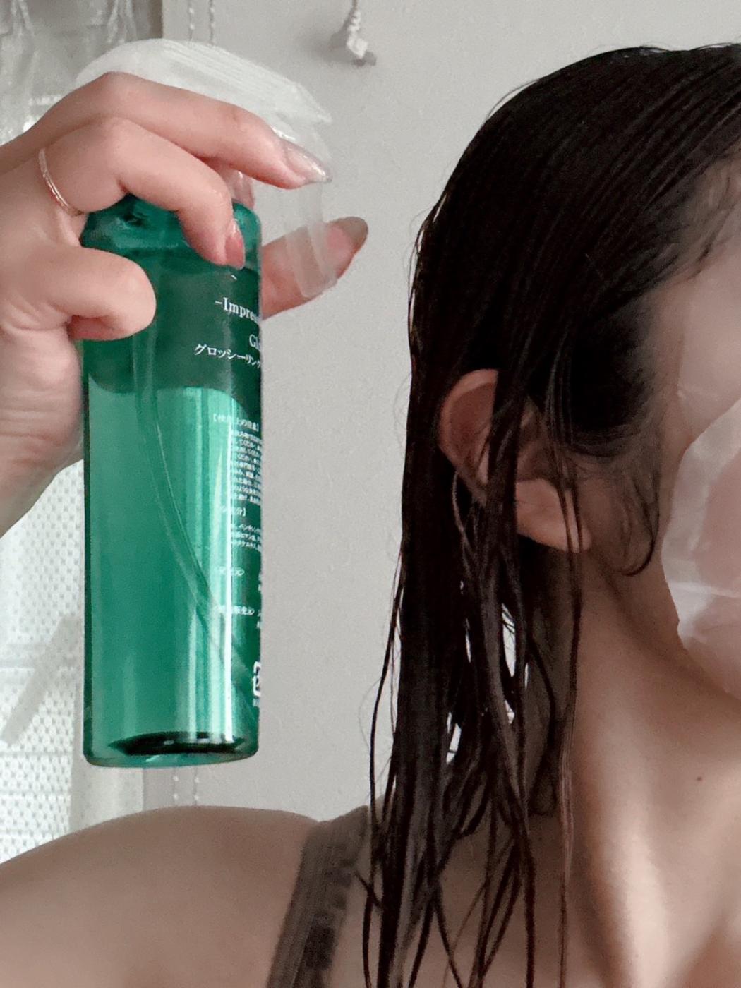 使用方法は、タオルドライ後にまず【グロッシーアルファ】を頭皮と髪の毛に吹きかけます。