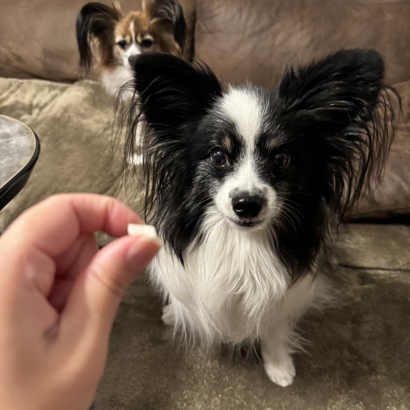 メレンゲクッキーのような軽くて白いキューブタイプになってるのですが雷と美輝(みら)は5kg以下なので1/2〜1粒になるため、1/2にカット(初めは便が緩くなることもあるため)してあげてみました。