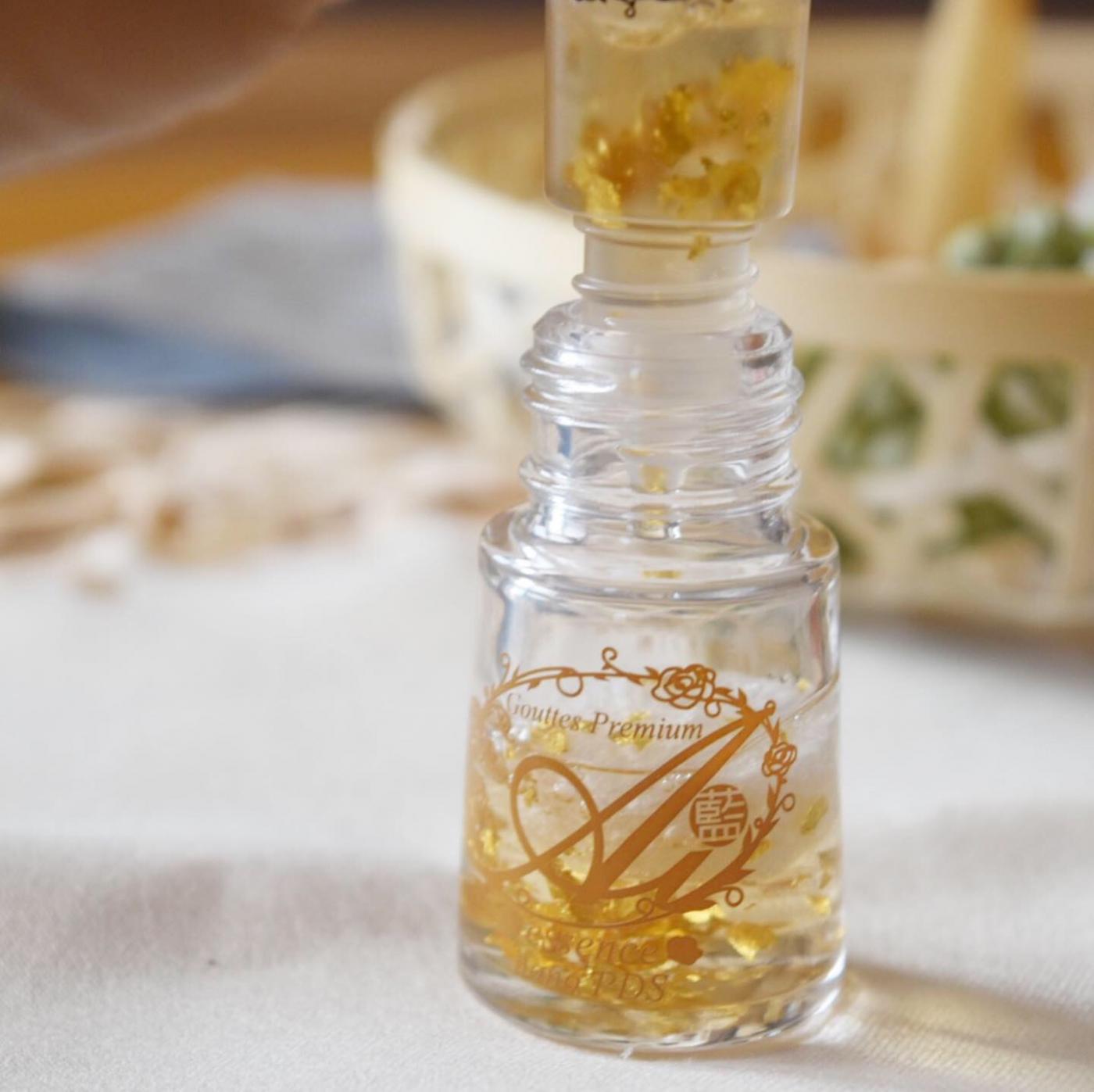 そこへ2剤として、上質な金箔の入った溶液を注入し、混ぜ合わせる事でフレッシュなつくりたての美容液を作ることができるんです。
