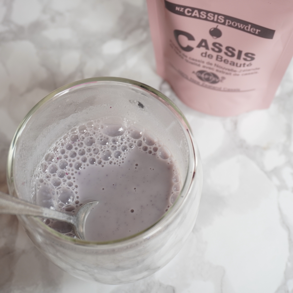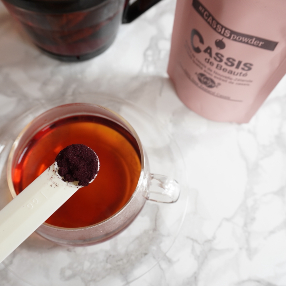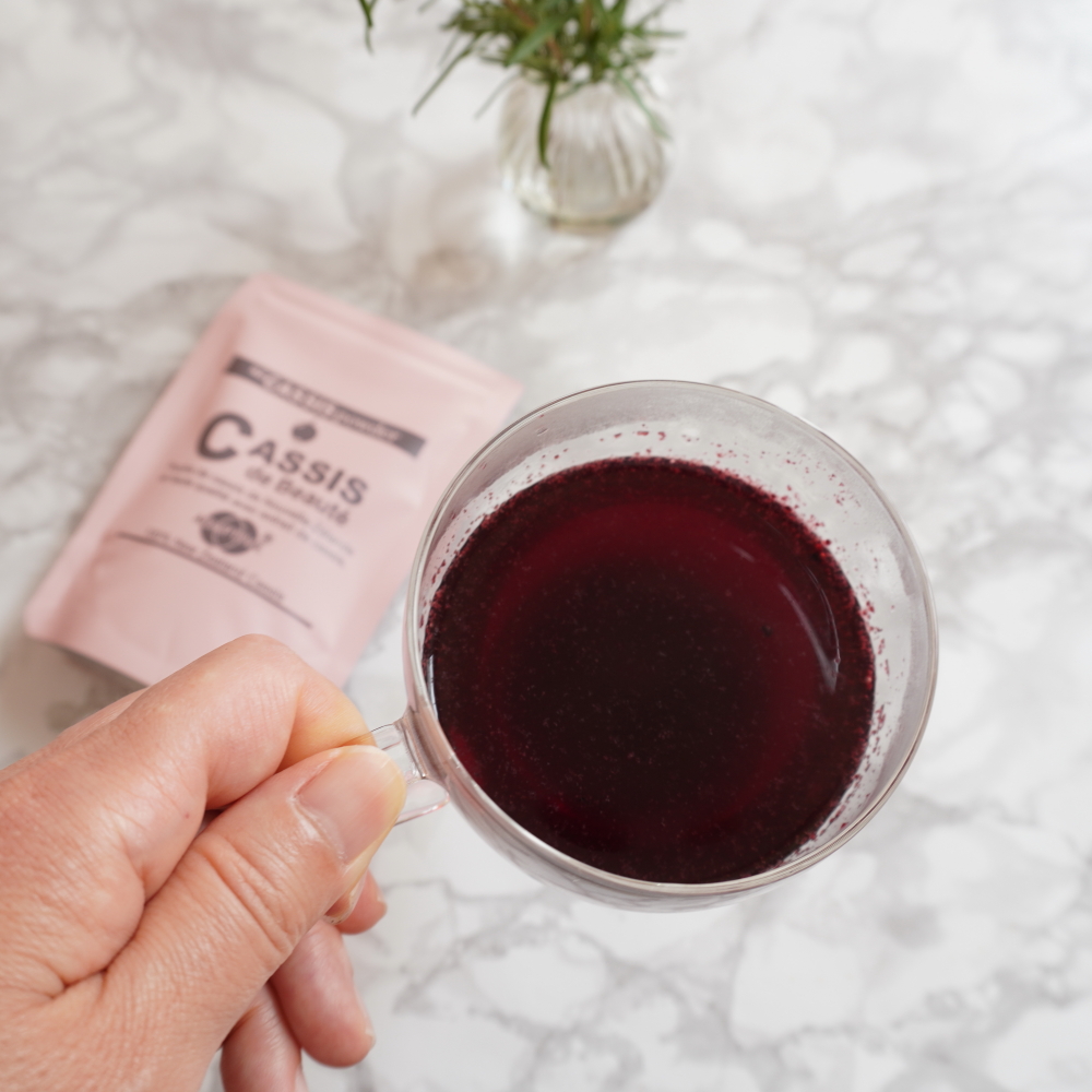 カシスの粉末にお湯を注いで寝る前にいただくと体がポカポカ。